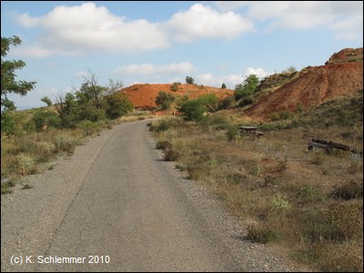 Mitten in der Ebene ein felsiger Einschnitt.Die Türme einer Fabrik tauchen auf.