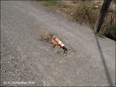 "Gefährliche Kreuzung" steht auf dem Schild! Na ja! Eine Brücke über einen ausgetrockneten Bach: wenn es regnet, sieht es hier schnell anders aus!