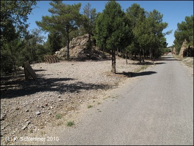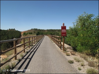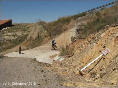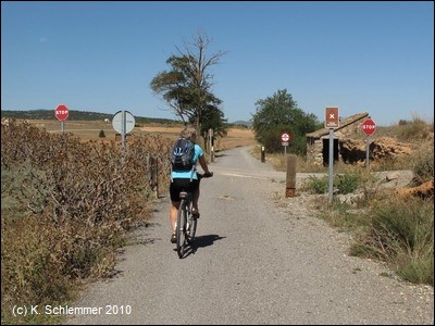 Rund 50 Kilometer trennen den Radler noch von den Eisenminen von Ojos Negros, rund 30 Kilometer sind auf der alten Bahntrasse noch ausgebaut. Das letzte Stück zum Beginn der Bahnstrecke muss man auf Nebenstraßen fahren, bis vielleicht irgendwann die Bahnstrecke noch ausgebaut wird. Nach der Hauptstadt Teruel führt die Trasse zuerst leicht bergauf, bei Cella erreicht man den Rio Jiloca, dem die Strecke weiter folgt. Es geht durch eine schier endlose weite Hochebene, die dem Radler einiges an Ausdauer auf diesem geraden und eintönigen Abschnitt abverlangt. Auch mit Widrigkeiten des Wetters muss gerechnet werden, es gibt in diesem Abschnitt kaum Unterschlupfmöglichkeiten. Heftiger Wind kann die Fahrtdauer erheblich verlängern! Die verlassenen Minen mit ihren verfallenden Gebäuden haben allerdings ihren eigenen Reiz. Die Gegend ist entvölkert, Projekte zur Verbesserung des Tourismus sind offensichlich in Planung. 2010 sahen wir die Schilder eines Unternehmens, das einige der alten Gebäude zu einer ländlichen Unterkunft ausbauen will. In diesem Jahr waren auch die Schienen bei Ojos Negros entfernt, die zuvor noch bis zu den alten Gebäuden führten. Vielleicht ist doch noch ein weiterer Radwegausbau geplant. Über der Hochebene bei Ojos Negros in Richtung Monreal del Campo steht noch eine alte Windmühle, die schön restauriert wurde und dafür sogar einen Preis erhielt. Von dort aus hat man einen herrlichen Blick über die Landschaft des Rio Jiloca. Ein weiterer markanter Punkt ist die Felsenburg Castillo de Peracense, wahrscheinlich aus dem 13. Jahrhundert.