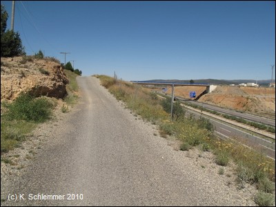 Vor La Puebla de Valverde kommen wir wieder in den Bereich der Autobahn, teilweise ist die Trasse zerstört. Der Radweg wurde neu gestaltet. Über eine Brücke mit blauen Geländern kann man die nahe Tankstelle erreichen, wenn man Proviant benötigt. Dann geht es weiter Richtung Passhöhe.