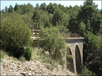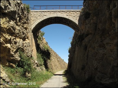 Eine kleine Bücke führt über einen trockenen Bachlauf. Wieder wird die Bahnstrecke Valencia-Zaragaza überquert, eine Metallbrücke wurde hierfür gebaut.