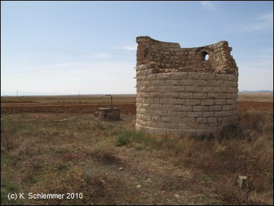 Der alte Brunnen existiert noch. Vorbei an den alten Ruinen geht es durch die staubige Ebene.
