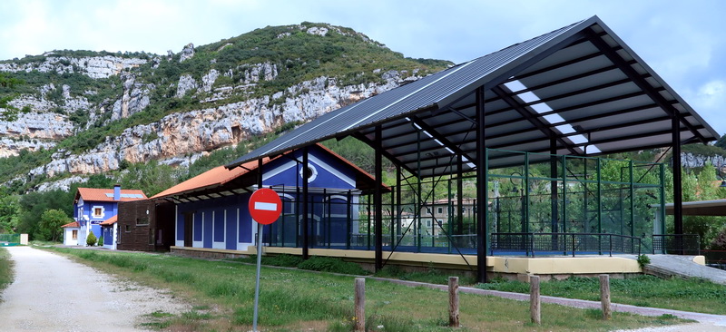 Der Bahnhof von Sotopalacios ist eine baufällige Ruine. Aber der schattige Rastplatz unter den großen Bäumen ist neu!