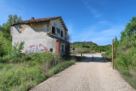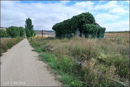 Eine Infotafel und ein Wegweiser, so beginnt der Radweg "La Bureba". Ein holpriger Feldweg, teils zugewachsen, führt auf der Trasse zurück Richtung Burgos, wo die alte Bahnstrecke von Straßen und Industrieanlagen überbaut wurde. Die Vía Verde selbst ist nicht asphaltiert, sondern erhielt eine Decke aus festgewalztem Splitt und Sand, an manchen Stellen auch schon wieder recht lose.