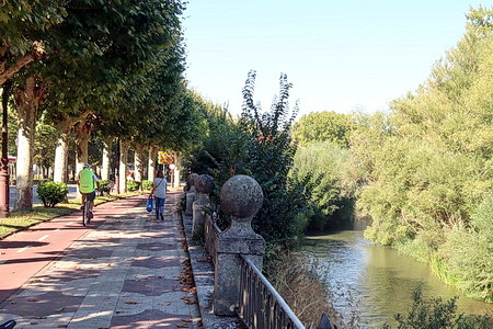 Weniger gut zu finden ist ohne GPS der Ausgangspunkt der Vía Verde, der ca. 9 km nördlich inmitten der Felder beginnt. Wegweiser haben wir vergeblich gesucht. Jenseits der Industriegebiete am nördlichen Stadtrand bei dem kleinen Ort Sotragero beginnt (oder endet) die ausgebaute Strecke - etwa bei Kilometer 22 des Radwegs. Die folgende Beschreibung ist eine Möglichkeit, den Startpunkt mit dem Fahrrad zu erreichen. Um den Burgberg zu umgehen kann man zunächst dem Radweg am Rio Arlanzon flussabwärts folgen (ca. 1,5 km), überquert dann den Fluss an der Avenida de la Universidad. Am nächsten Kreisverkehr (Avenida Oscar Romero) beginnt ein roter Radweg, der am großen Friedhof (Cementerio Municipal San José) vorbei in das Industriegebiet im Norden der Stadt führt.