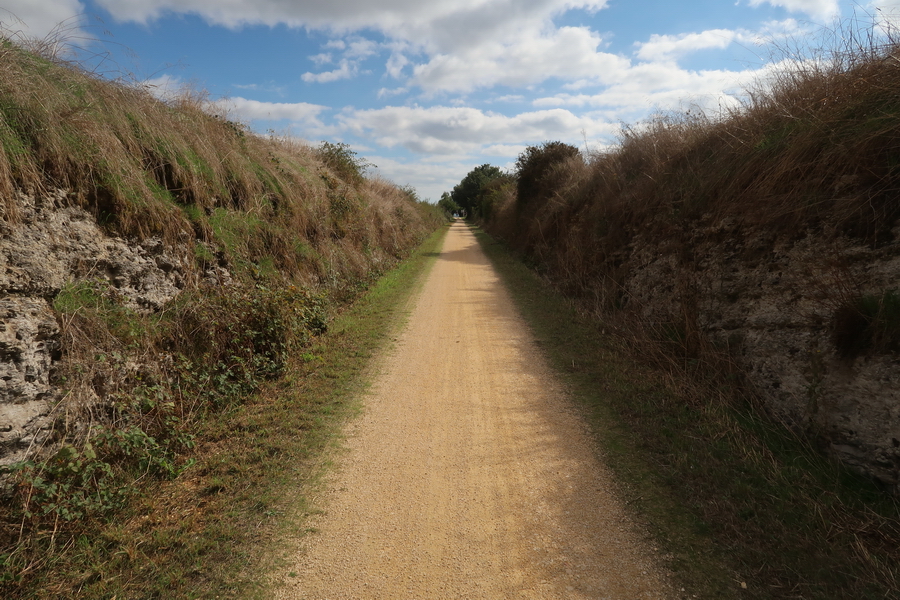 Wieder folgt ein langer, flacher und kerzengerader Einschnitt in Landschaft. Wir erreichen Kilometer 5.