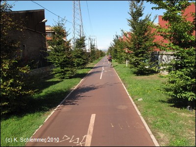 Die Region ist dicht bebaut, dennoch ein breiter Weg für Fußgänger und Radler.