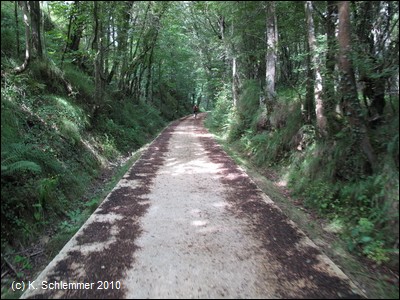 Nach Überquerung der Straße geht es wieder auf die alte Trasse. Ein kurzer Abschnitt wurde mit einer Betondecke befestigt.