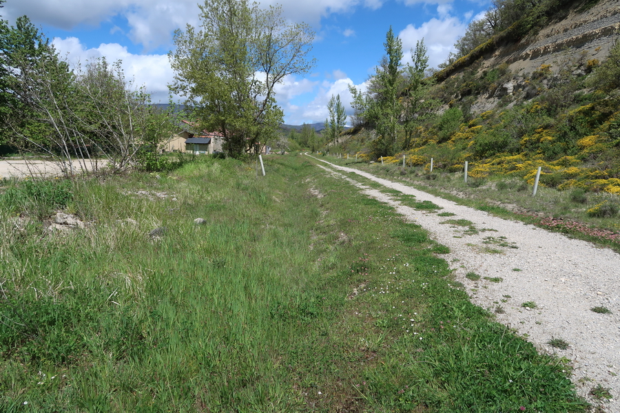 Das Empfangsgebäude wird privat genutzt. Blick zurück zum Lagerhaus und den Felswänden hoch über dem Radweg.