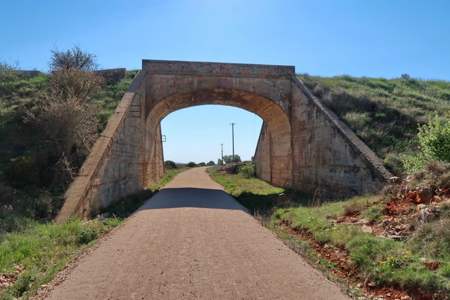 Brücke über den Río Rituerto (Nebenfluss des Duero) bei Kilometer 71,3 der Bahnstrecke. Rechts in der Ferne auf dem Hügel erkennt man die Ruinen des Ortes Albocabe und der Kirche Santa María de la Mayor, in etwas über 1000 m Höhe gelegen. Die letzten Bewohner verließen den Ort in den 1960er Jahren.