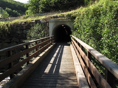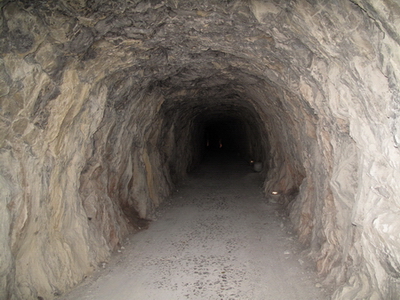 103 m lang ist diese Röhre, nur grob aus dem Felsen gehauen. Die Enge und die Dunkelheit wirken beklemmend - hier fuhren früher die Dampfloks der Minenbahn, wahrscheinlich blieb kaum Luft zum Atmen.