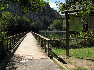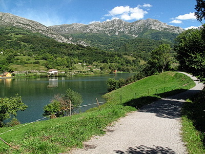 Die Berge am Horizont sind nicht die Alpen, sondern die Berge Asturiens! Ein langer Holzsteg bringt den Radler auf das andere Ufer des Sees.