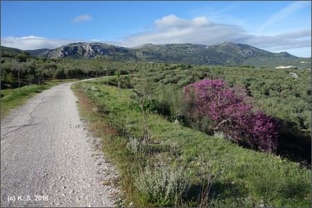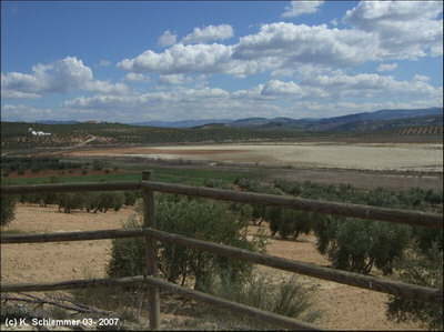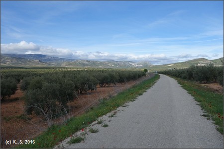 Eine weite Ebene tut sich auf, in der Ferne erkennt man schon die Berge der Sierra Subbética.