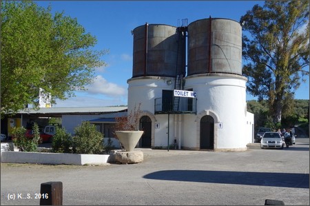 Im Bahnhof ist eine Gaststätte eingerichtet, die alten Wasserbehälter dienen als Toiletten.