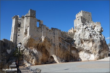 Vor uns am Hang das Dorf Zuheros, überragt von seiner Burg und dem schroffen Felsmassiv.