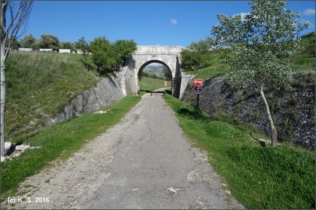 Schon naht das nächste Viadukt. Die Bauform hat ihm den kuriosen Namen eingebracht: "Die Zähne der alten Frau". Eine Brücke kreuzt die Trasse.