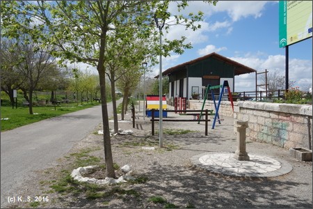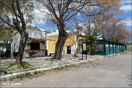 Und nach dem Ortsende ein Rastplatz. Weiter geradeaus durch die Olivenhaine.