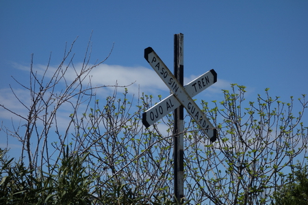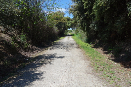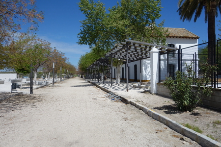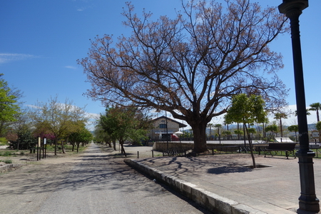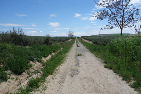 "Unbeschrankter Bahnübergang". Eine Allee führt am Rande von Lucena entlang Richtung Bahnhof.....