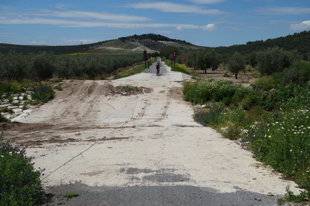 Hinter der Kuppe liegt der alte Bahnhof Campo Real. Kilometer 8, Ende des Ausbaus auf der Trasse. Hier mündete die alte Bahnstrecke in die heute noch aktive Strecke von Córdoba ein. Wir haben 119 km Radweg von Jaén aus gemessen.