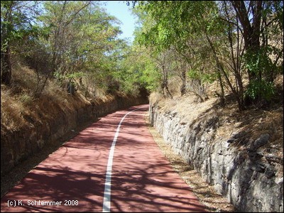 Im folgenden Abschnitt müssen einige kleine "Buckel" überwunden werden, dann geht es kerzengerade parallel zur Straße am Rand des Flusstales entlang.