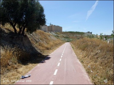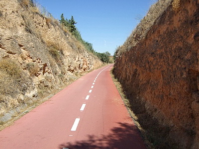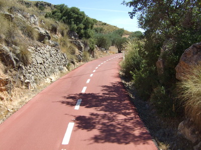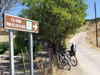 Einen Kilometer außerhalb des Ortes , etwa bei km 17 des Radwegs, zweigt die Via Verde wieder von der Straße nach links ab auf die Trasse. Die Doppelsperren stehen unangenehm eng, man muss aufpassen, dass man nicht mit dem Lenker hängen bleibt. Vorsicht auch in diesem Abschnitt, manchmal benutzen Traktoren die Strecke zur Bearbeitung der Olivenplantagen.