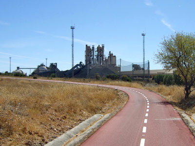 Die Silhuette eines riesigen Schotterwerks taucht vor uns auf. Der Scheitelpunkt der Strecke ist erreicht, ab hier geht es bergab.
