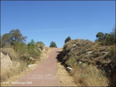 Man erreicht einen Rastplatz noch vor dem Gipfel des Radwegeabschnitts. Ein alter Schienenstrang wurde belassen, zur Erinnerung an die Bahnstrecke. Noch durch einen felsigen Einschnitt, dann wird der Blick frei.
