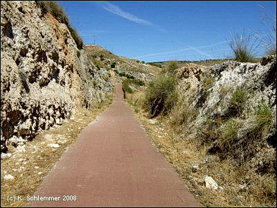 Umleitung (Desvio): Neben der Straße nach Brea de Tajo entlang, dann links den Schildern folgen. Noch vor Carabaña zweigt die Vía Verde "Tren de los 40 Dias" nach rechts ab den Berg hinauf und folgt der M-221. Die Via Verde del Tajuña führt weiter geradeaus. Die Einschnitte der alten Bahnlinie sind nun wieder direkt rechts neben dem Radweg zu erkennen.