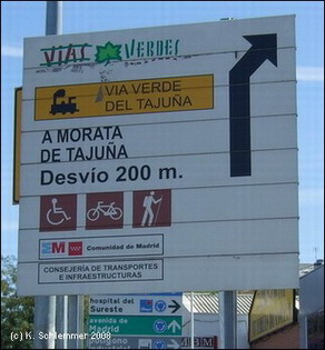 Vía Verde-Umleitungsschild an der Avenida de Madrid/Ejército (2008). Noch 14,8 km nach Morata de Tajuña.