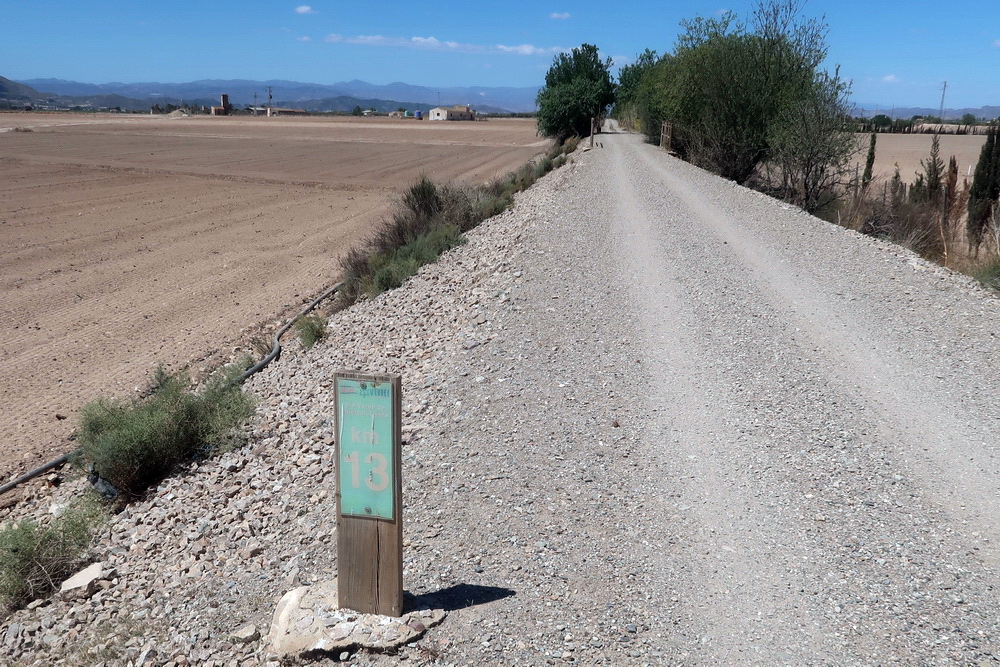 Auch die Schilder des Vía Verde sind in die Jahre gekommen. Kilometer 13 kann man gerade noch lesen.