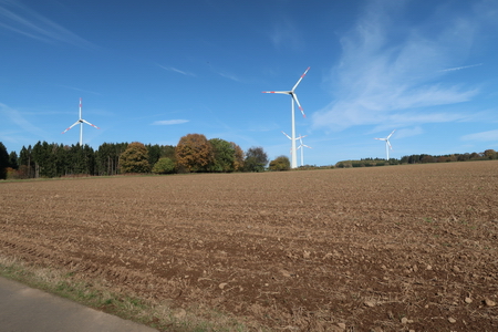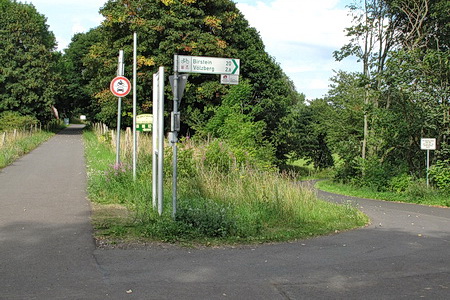 In einer Höhe von 565 m ü.NN zweigt der Südbahnradweg vom Vulkanradweg in südöstlicher Richtung ab, 28,7 km vom Beginn des Radwegs auf der Bahntrasse in Lauterbach entfernt. Man fährt bergab, an den Windkraftanlagen vorbei.