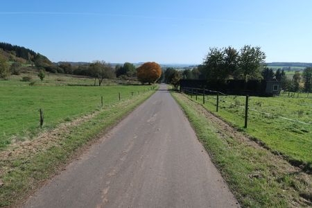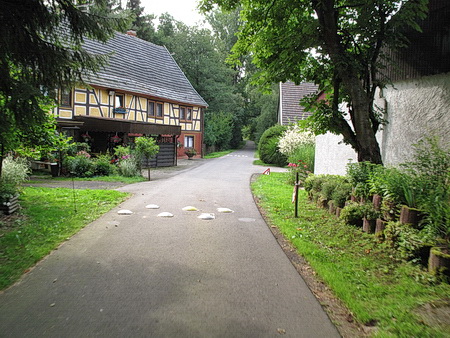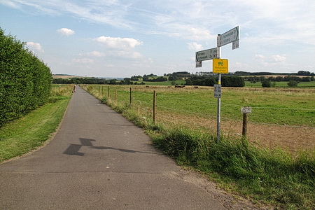 Rechts halten und der Beschilderung folgen. Die gesamte Strecke ist asphaltiert. In flotter Fahrt geht es abwärts durch die Felder. Nach dem Ort Völzberg wird es etwas flacher- Vorsicht, Rücksicht nehmen auf Traktoren.