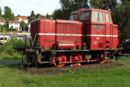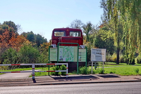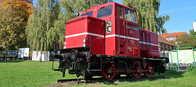 Vor uns liegt das Lokdenkmal der Vogelsberger Südbahn (1898 -1967). Hier ist auch ein kleiner Rastplatz entstanden.