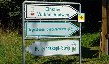 Da der Vulkanradweg auch ein Teil des Bahnradweg Hessen ist, findet man entlang der Strecke auch diese Beschilderung mit Entfernuns- und Höhenangaben. Ab Hutzdorf folgt man dem R7a.