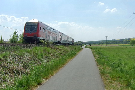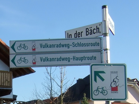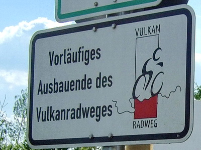 Der Radweg auf der Bahntrasse endet hier. Aber die Beschilderung des Vulkanradwegs führt weiter nach Altenstadt - noch 10 km, an der aktiven Bahnstrecke entlang.