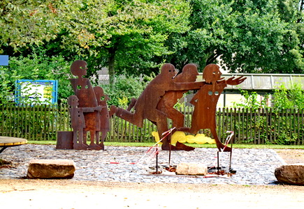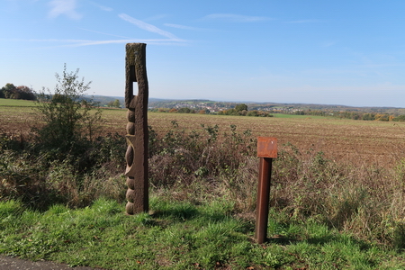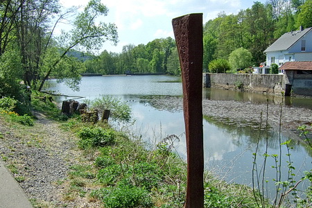 Aus dem Waldgebiet heraus auf dem Bergrücken entlang hat man einen fantastischen Weitblick - so heißt auch diese eiserne Stele, eine von 13 aus Eisen gegossene Stelen entlang des Radwegs. Die Tafel mit dem schematischen Streckenverlauf und der Bedeutung der Objekte ist inzwischen verschwunden. Kurz darauf erreicht man Ober-Seemen. Hier gab es bis vor kurzem noch eine Umleitung durch den Ort.