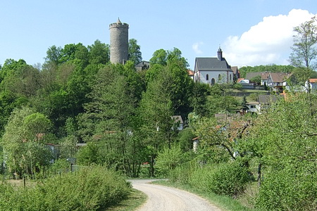Wieder durch den Wald, die eisernen Stelen begleiten uns nach Lißberg. Schon von weitem erkennt man den runden Burgturm der einstigen Stadt.