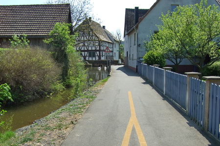 Nun geht es hinunter nach Gedern. Die zwei großen Schleifen zur Überwindung des Höhenunterschieds erfordern auch eine mehrfache Überquerung des Mühlbaches. Bemerkenswert und zur Nachahmung empfohlen: An den kleineren Querwegen hat der Radweg Vorfahrt!