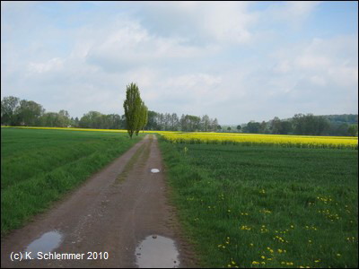 Dort trifft man auf die alte Bahnstrecke. Die Gleise sind abgebaut (Blick Richtung Duderstadt. Wir folgen der Beschilderung nach Mingerode auf einer Nebenstraße.