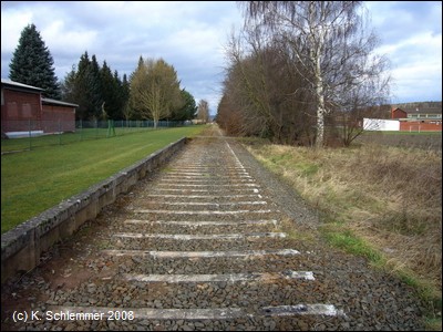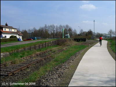 Betonierter Radweg Richtung Bahnhof, Reste der Gleisanlagen und andere Bahnrelikte!