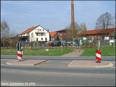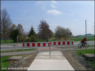 Beginn des Radwegs auf der Trasse an der B 27 in Gieboldehausen. Die üblichen Sperren, viel zu nahe an der Straße, eine Verkehrsinsel soll das Überqueren der gefährlichen Bundesstraße erleichtern.