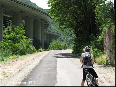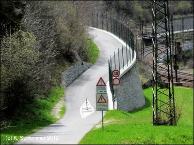 Die Beschilderung führt uns talwärts auf der linken Seite der Staatsstraße. Dann biegt der Radweg nach links ab, überquert einen Bach und folgt der Bahnlinie.