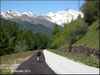 Dann biegt der Radweg wieder links ab und unterquert die Bahnstrecke. In flotter Fahrt bergab erreicht man Gossensass.