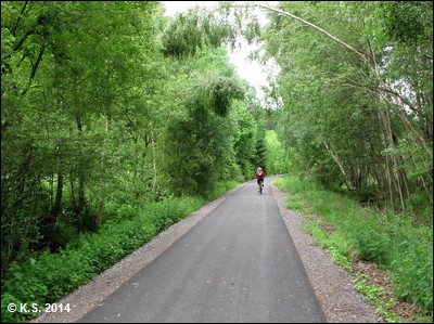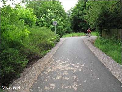 Nach der neuen Brücke geht es links hinauf auf die Trasse(Blick zurück) und weiter Richtung Haltepunkt Grenzhammer. Vorsicht an der (barrierefreien) Kreuzung, Stoppschild beachten!