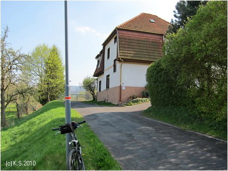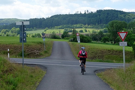 An der Hütte vorbei zeigt die Beschilderung, zur Landstraße geht es in die andere Richtung. Der neue Radweg führt nach der Kurve steil bergab!