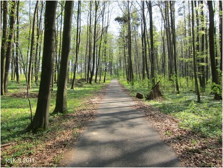 Fast ohne Steigung am Waldrand entlang, dann durch den Frühlingswald ein kurzes Stück aufwärts.