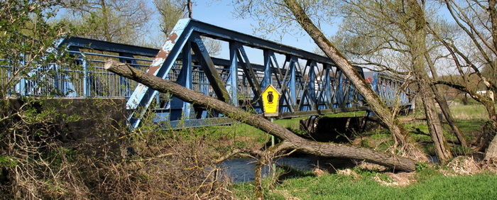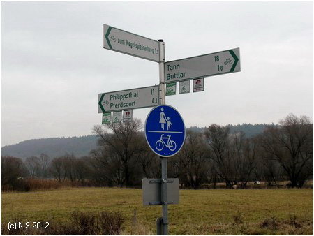 Ein Wegweiser nach Oechsen war 2015 nicht zu finden, aber man folgt zunächst dem Ulstertalradweg nach Buttlar. Auf den beiden blauen Brücken wird zunächst die Taft, dann die Ulster überquert.