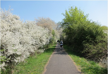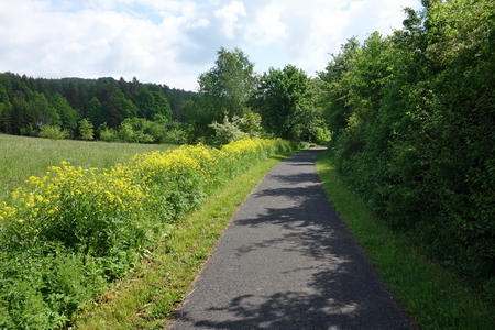 Auf der breiten Asphaltstrecke der ausgbauten Bahntrasse geht es nach Buttlar, vorbei an den originellen Ruhebänken. In Buttlar ist die Trasse nicht befahrbar (Industriegelände). Man muss die Bundesstraße 84 überqueren und dem Kirschweg bergauf folgen. Die nächste Querstraße ist bereits wieder die alte Bahntrasse. Rechts abbiegen Richtung Friedhof und Kirche (Michelsbergweg).