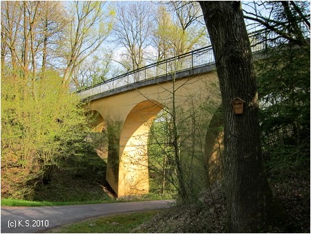 Über einen Wegedurchlass, dann über die Brücke an der Sängerwiese bei Bermbach, 3 Bögen, 32 m lang und 8 m hoch.