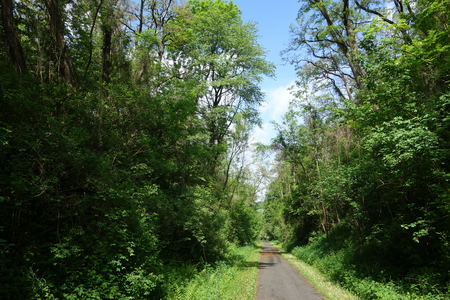 Im Frühjahr durchquert man hier ein wahres Blütenmeer. Dieser Streckenabschnitt benötigte 2016 dringend eine Ausbesserung der Fahrbahnschäden (s. Schild!)